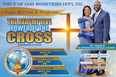 You are specially invited to a 3-Day power-packed Easter Revival Program. Come and experience the redemptive power of the cross and a life-changing encounter with God. Invite your family, friends, and loved ones. Your life will never remain the same. May God bless you mightily in Jesus name. Amen.